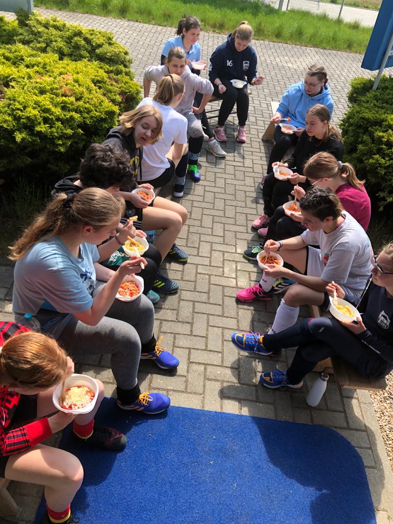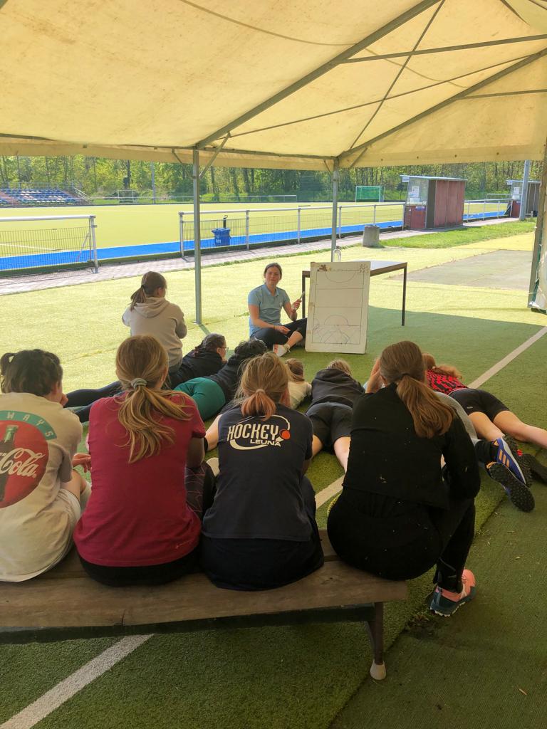 In der Mittagspause kochte Siri Nudeln mit Tomatensoße, so wie im Hockeycamp. Nach kurzer Ruhepause ging es an der Taktiktafel weiter. Zusammen wurden die Aufgaben und Spielbereiche der einzelnen Positionen besprochen.