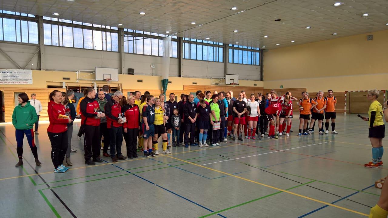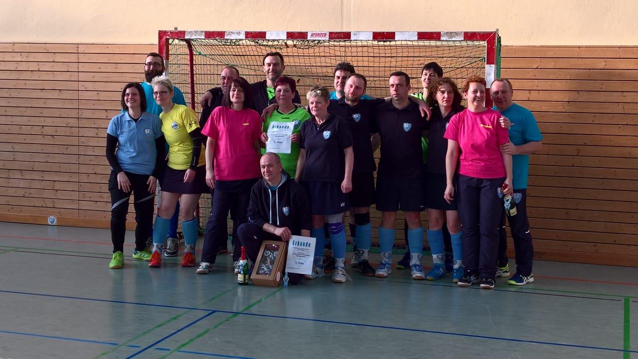 Bei Temperaturen von 14°, die im Laufe des Tages gefühlt immer weniger wurden, starteten wir in die Vorrundenspiele. Unserer neu formierten Mannschaft mit Benny im Tor, Kaj und Ralph in der Verteidigung und Bea, Jeanette, Dirk, Steffen und Holger im Sturm musste sich zunächst erstmal finden. Die Spiele gegen Erfurt und Bautzen gingen nur knapp verloren. Allerdings gegen Angstgegner Jena gelang durch Tore von Dirk (2) und Jeanette (1) ein 3:0 Erfolg. Nach einer längeren Spielpause konnten wir in den beiden letzten Spielen gegen Potsdam und Bautzen jedoch nicht mehr punkten. Am Ende teilten sich alle letztplazierte Mannschaften, wie wir, den 7.Platz.