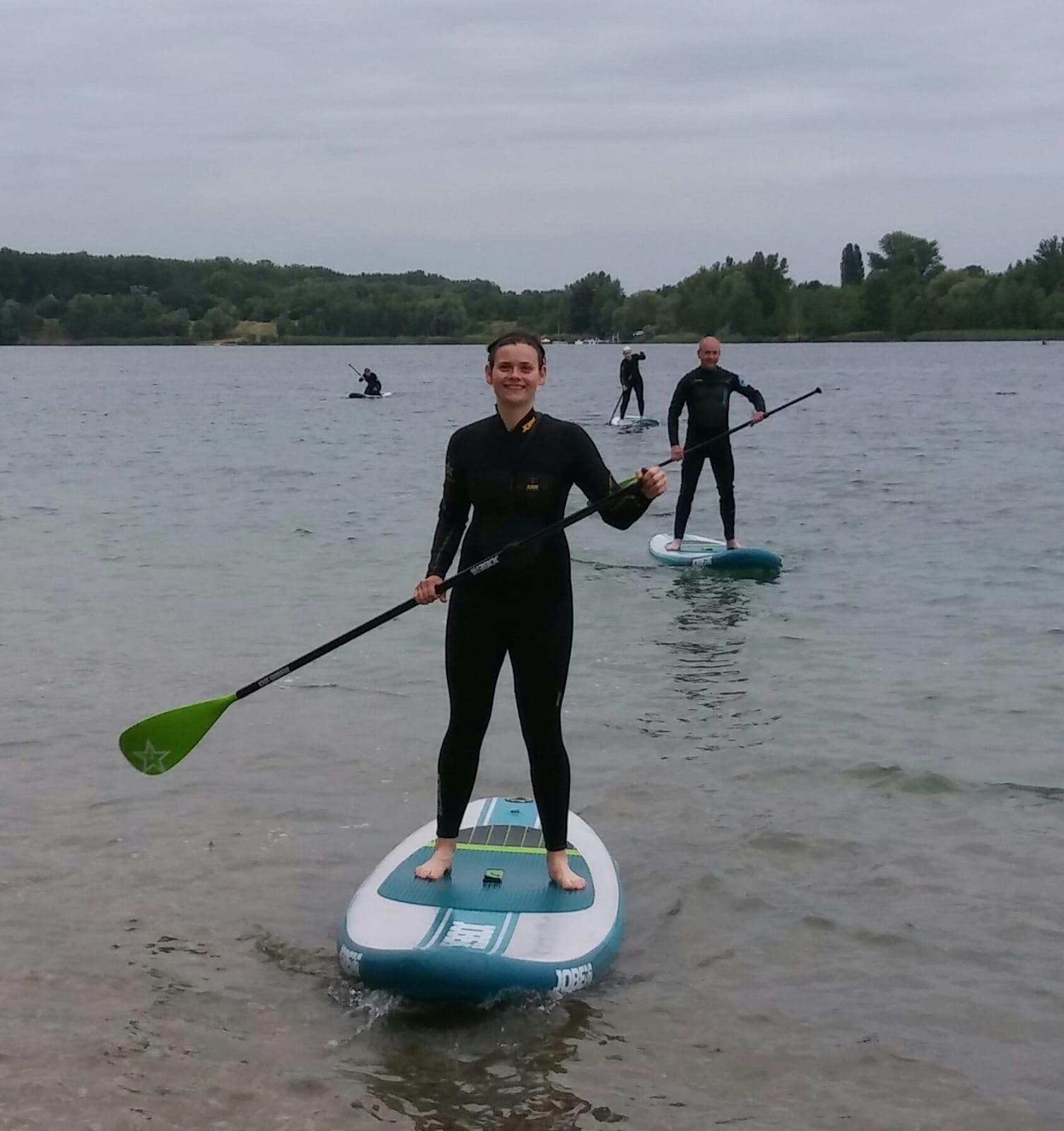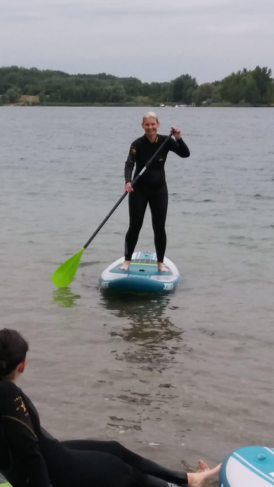 In der Einführung wurde der richtige Umgang mit dem Board gezeigt. Zu Beginn sollten alle auf dem Board kniend fortbewegen. Das klappte auch super. Nur Renate wollte gleich aufs Ganze gehen. Sie stand auf dem Board, wenn auch nur kurz und nahm als erste Kontakt mit dem Wasser auf.