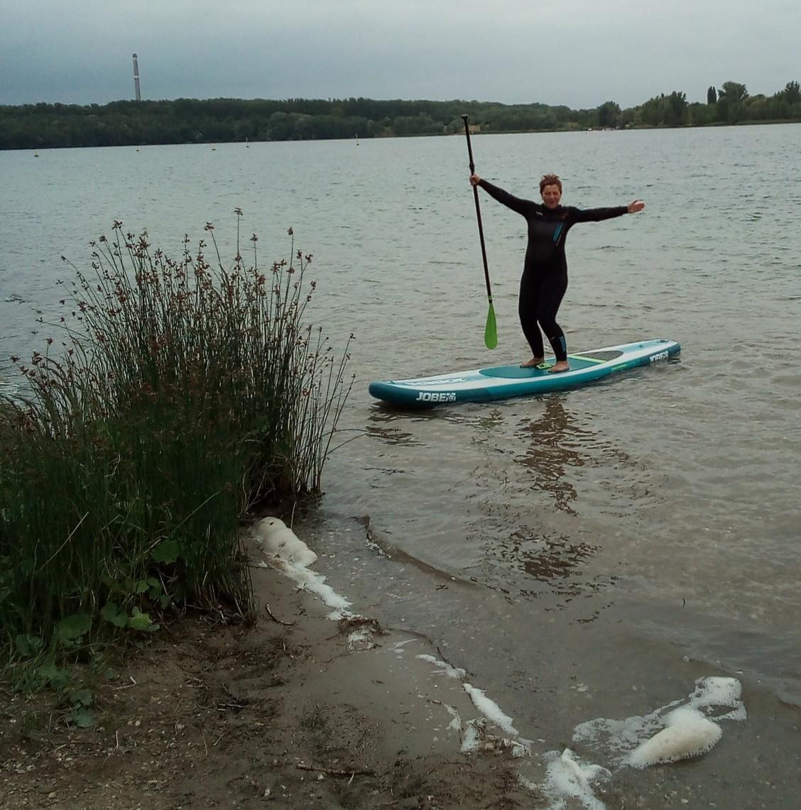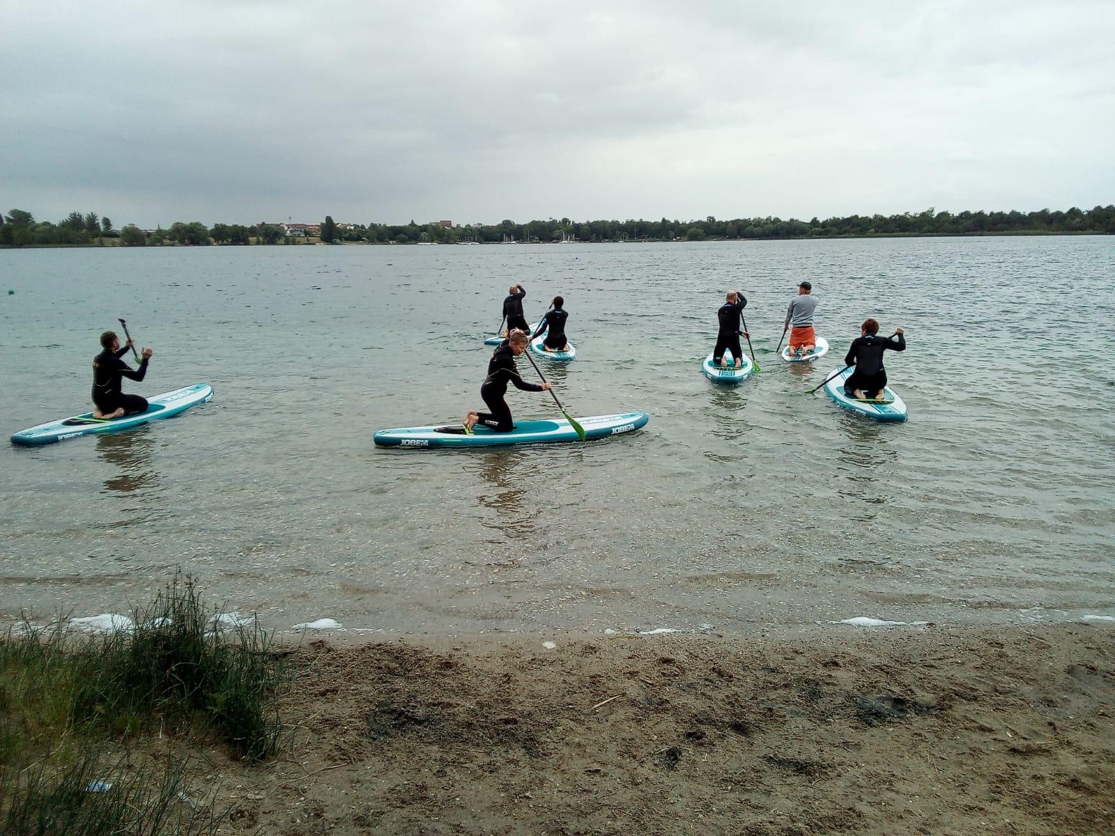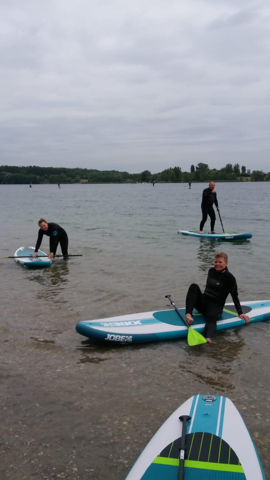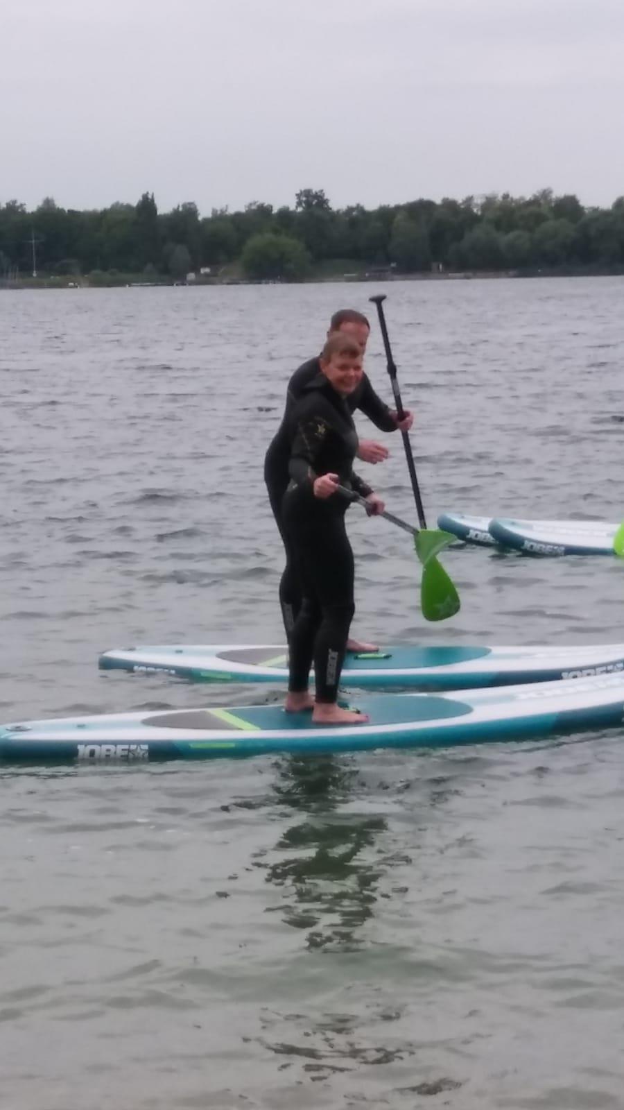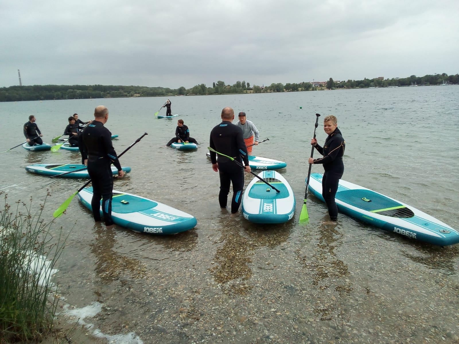 Als Herausforderung galt es paarweise sich zusammen zu finden und auf dem Wasser, natürlich auf dem Board stehend, die Positionen zu Tauschen und anschließend auf dem Board des anderen zu stehen. Als erstes meisterten die Bea und Siri. Renate probierte diese Übung mit dem Coach und verhalf im zu seinem ersten Bad in diesem Jahr.