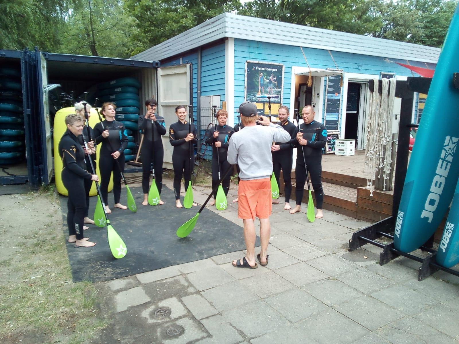 Aus einem leicht dahin gesagten „Das könnte man ja mal machen!?“ wurde ein fester Plan. Im Rahmen von Renates Geburtstagsgeschenk waren die Grünauer Hockeyeulen am Mittwoch, dem 13.06.2018, am Kulkwitzer See zum Stand-up-Paddling verabredet.