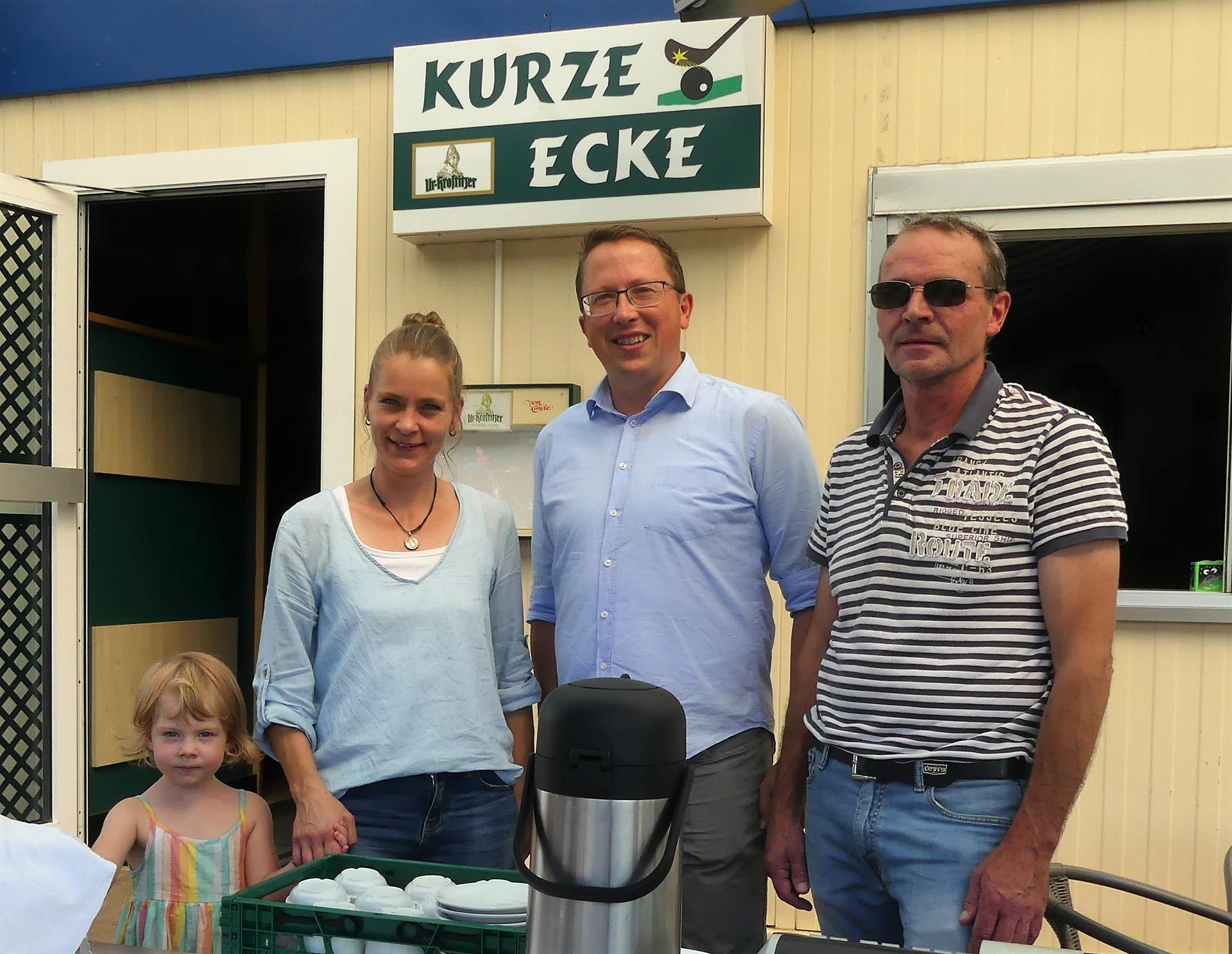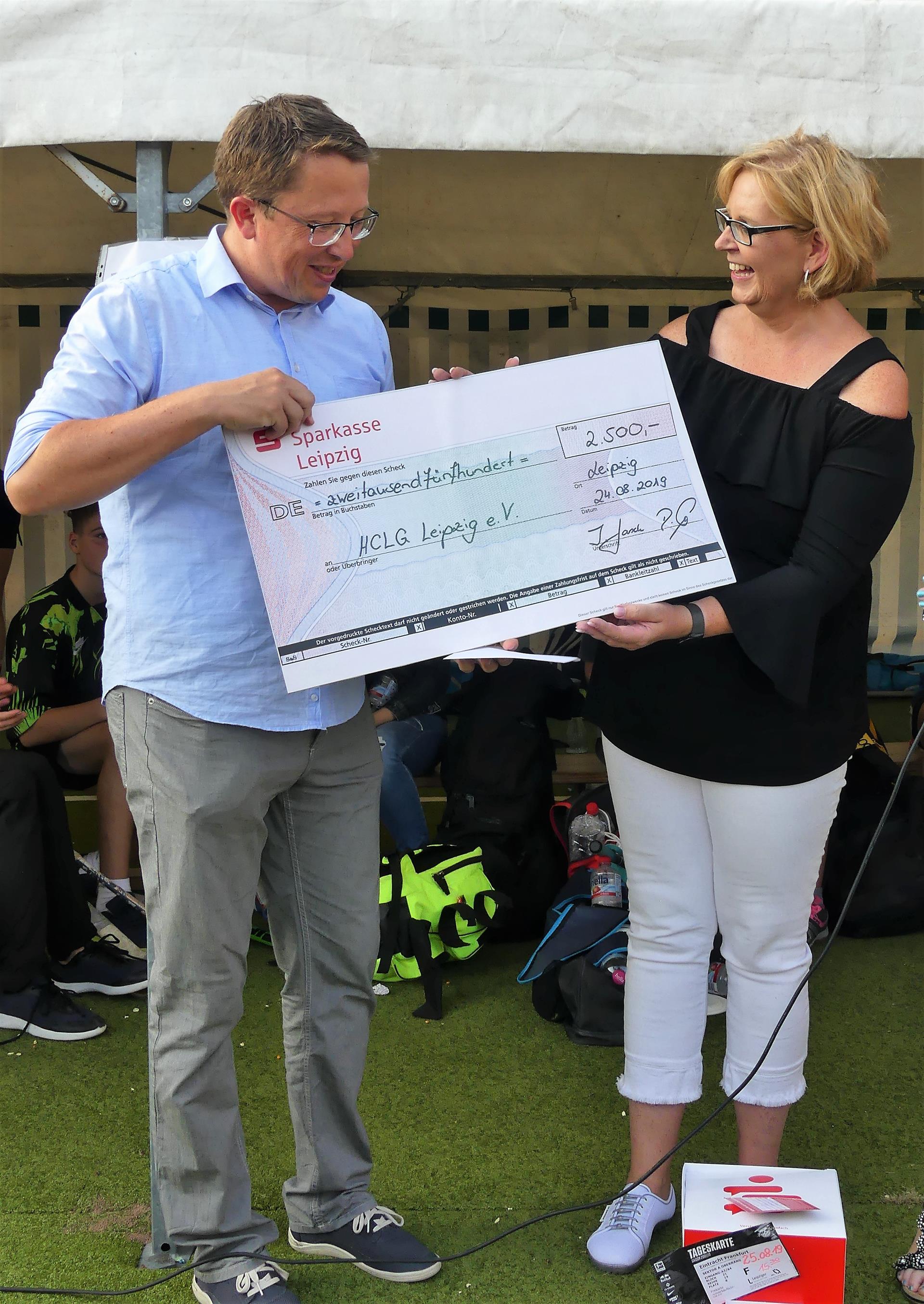 Aber auch neben dem Rasen wurde einiges geboten. Am erfreulichsten für alle Vereinsmitglieder war sicher die Wiedereröffnung der „Kurzen Ecke“ unter den neuen Betreibern um Jenny Schramm, von Präsident Jörg Hofmann herzlichst begrüßt und vom gut besuchten Seniorenstammtisch um Ehrenpräsident Ingolf Heßler sofort ausgiebig getestet. Wieder mit dabei war auch die Sparkasse Leipzig mit einem Stand. Und die Sparkasse war es auch, die zur Siegerehrung für große Beifallsstürme sorgte, als sie einen Spendenscheck in Höhe von 2500,-€ zur Sanierung unserer Tribüne an den HCLG übergab. Herzlichen Dank dafür! Eine weitere, wenn auch etwas kleinere Finanzspritze gab es für unseren jüngsten Hockeyspieler: die Senioren spendeten 200,-€ aus ihrer Mannschaftskasse an den Nachwuchs, übergeben von Andreas Rewald an unseren Präsidenten.
